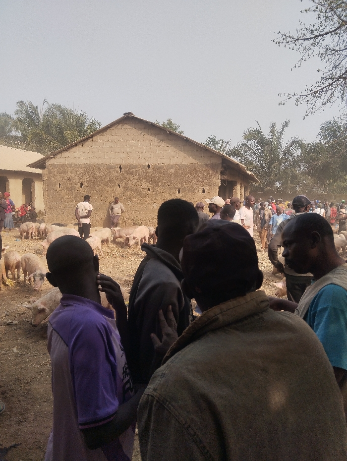 The scene depicts an outdoor gathering in Unguwan Rimi, Nigeria, under a hazy, light-blue sky. The ground is dry, consisting of light-brown dirt and dust. In the mid-ground, numerous light-colored pigs of varying sizes, from piglets to young hogs, are scattered across the dusty terrain; some stand, while others lie down. Two single-story structures with sloped roofs are visible in the background. The prominent building is constructed of unplastered, light-brown blocks or mud bricks and features several small, rectangular openings. Sparse green vegetation and the silhouette of a bare tree branch are visible in the background. A crowd of individuals, primarily adult males, occupies the foreground and mid-ground. In the immediate foreground, a person in a purple short-sleeved shirt stands on the left with their left hand near their head. To their right, a person in a dark jacket and another in a brown/olive green jacket are observed from the back, partially obscuring other individuals. Numerous other people are dispersed throughout the scene, gathered around the pigs, suggesting a market or communal animal gathering.