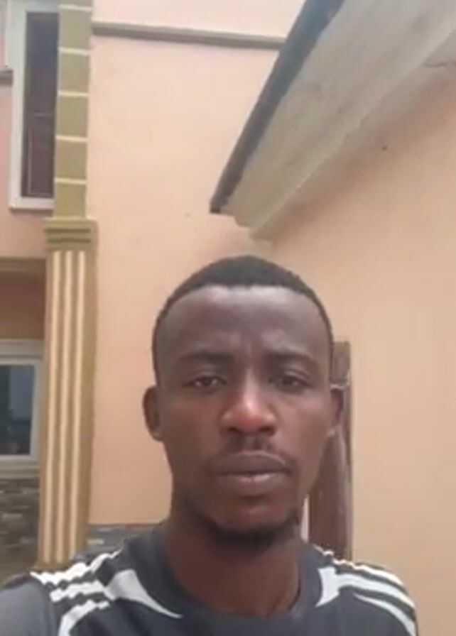 A man stands outdoors, facing the camera. He wears a dark t-shirt with white stripes on the shoulders. Behind him is a two-story house painted in a light peach color with white trim. The house has a dark tiled roof. The camera moves slightly as the man speaks. The scene appears to be a residential area.