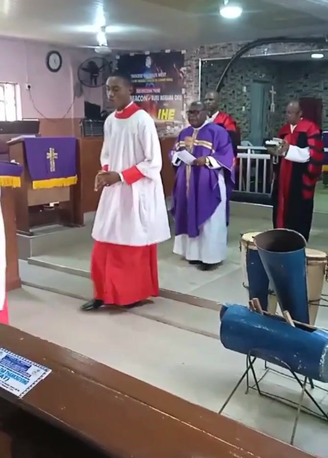 In an indoor setting, presumably a church, several individuals are observed in procession
