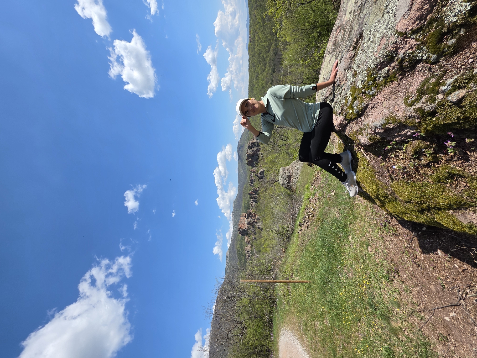 person in a light green long-sleeved shirt, black leggings, and light-colored sneakers, posing on a rock formation