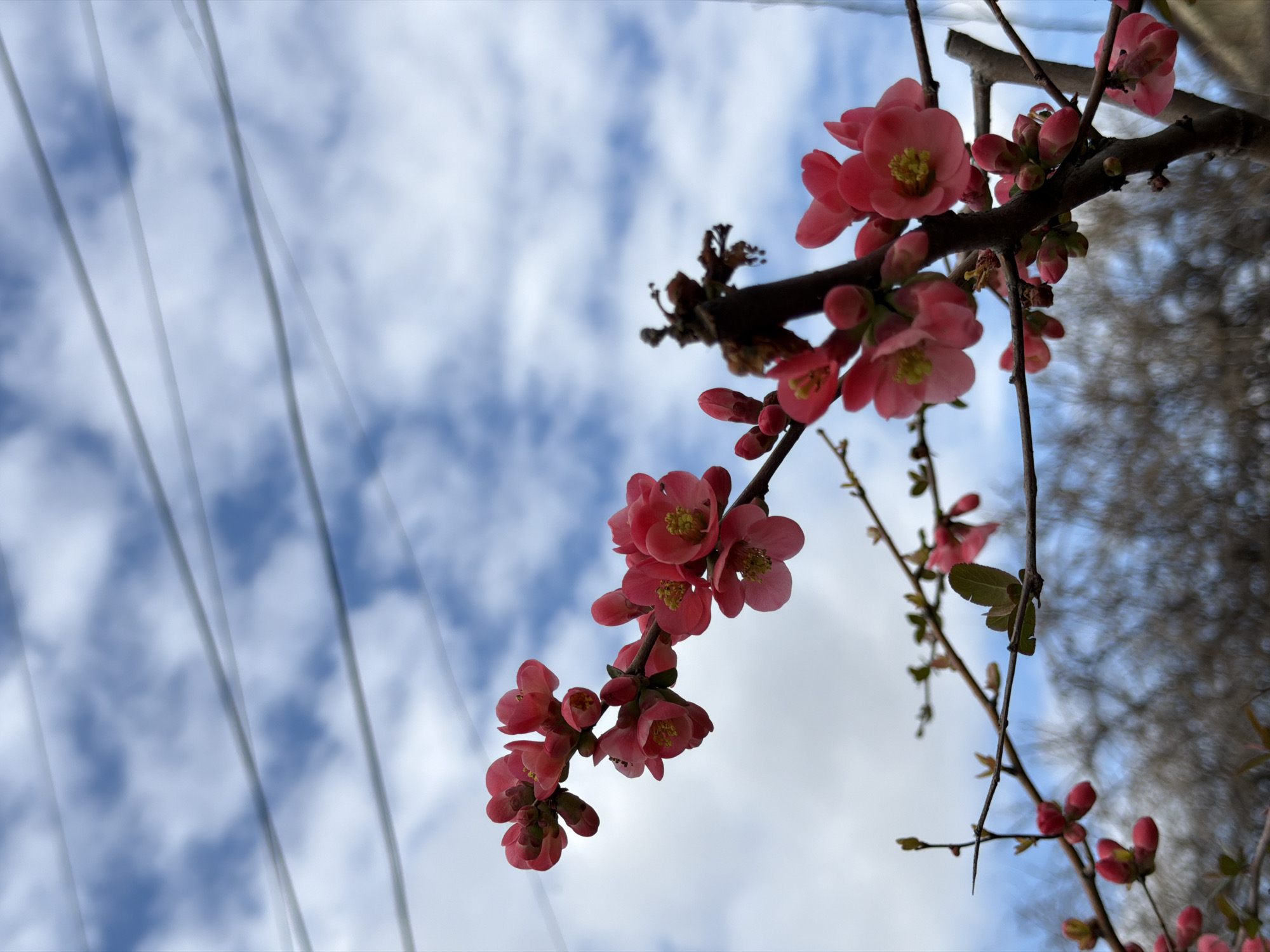 close-up view of a flowering branch against a blue sky with streaky clouds