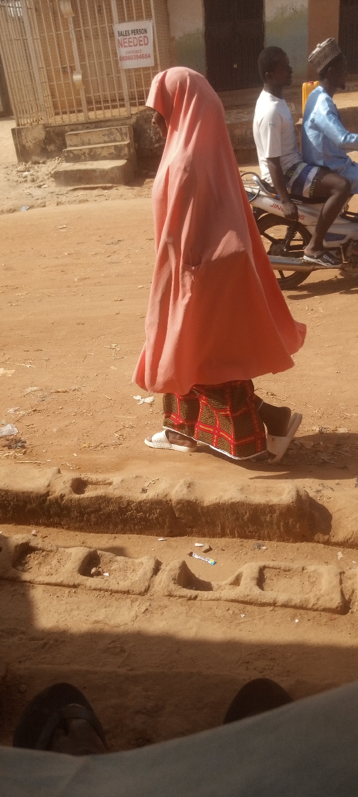 The image depicts an outdoor scene in Minna, Nigeria. A female individual is walking from the right to the left of the frame on an unpaved, reddish-brown dirt path. Her face and upper body are covered by a peach-colored veil. She wears a patterned skirt with red, black, and yellow geometric designs and white open-toe sandals. Behind her and to the right, two male individuals are on a white "JINGLING" brand motorcycle. The rider wears a white t-shirt, blue and white patterned shorts, and dark shoes, one bearing the word "ZEBRA." The passenger behind him wears a light blue long-sleeved shirt and a woven cap. In the background, a building with a metal gate and concrete steps displays a white sign with red text stating "SALES PERSON NEEDED" and a contact number "08060394684." Another building with a dark door is partially visible to the right. The immediate foreground reveals the feet of the observer, clad in dark sandals and light trousers. The ground features a raised, crude dirt/concrete structure with multiple depressions, and scattered litter, including pieces of white paper, a colorful wrapper, and cigarette butts. Strong overhead sunlight casts visible shadows.