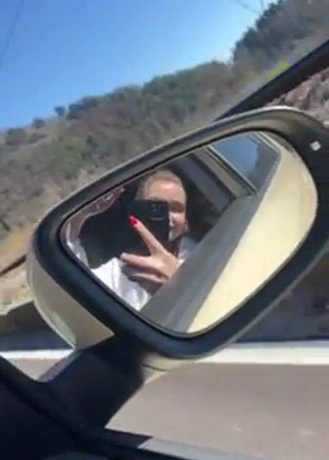 The video, shot on a bright sunny day, shows a person taking a selfie in a car's side mirror