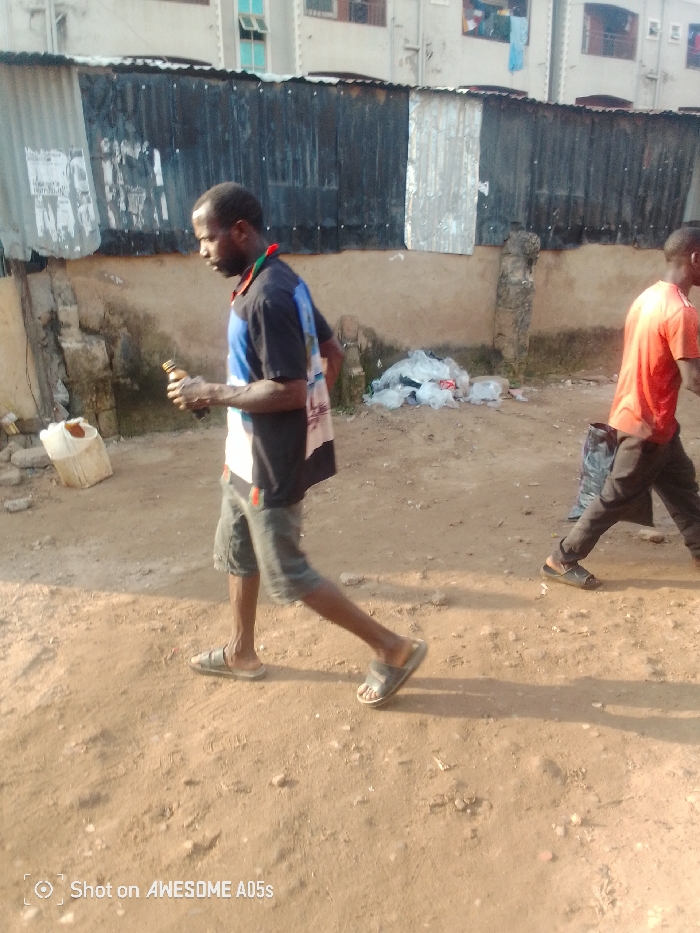 Two men walk on a sandy road beside a deteriorating wall topped with corrugated metal. One man, wearing a patterned shirt, dark shorts, and sandals, carries a bottle. The other man, in an orange shirt and dark pants, carries a bag. Trash is visible behind the wall. In the background, a multistory building stands. The image is taken outdoors, casting shadows on the road. A watermark reads "Shot on AWESOME A05s."