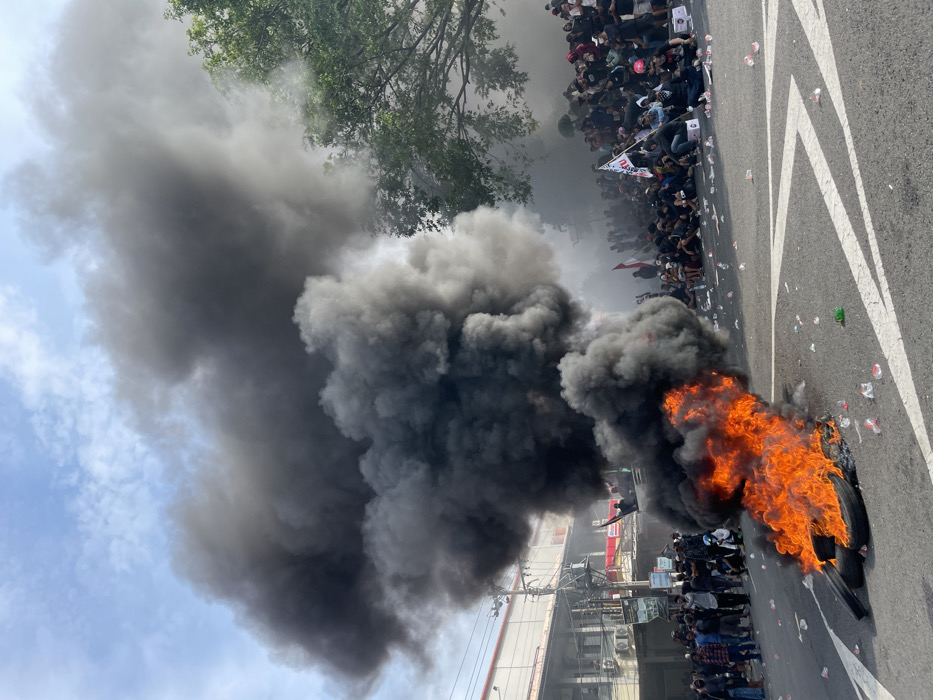 The image depicts an outdoor urban scene on an asphalt road in Kecamatan Pati, Indonesia, under a partly cloudy sky. The central feature is a significant fire consuming multiple vehicle tires, generating dense, black smoke that billows upward. Bright orange and yellow flames are visible at the base of the smoke plume. The road surface exhibits white painted markings and is littered with scattered plastic cups and bottles. Numerous individuals are present; a crowd stands on the left side of the road, adjacent to multi-story buildings featuring utility poles and visible air conditioning units. On the right, a larger gathering of people is seated on the road and pavement, extending into the background where green trees are visible. Within this seated crowd, several flags are present, including a prominent white flag with black text or a logo, and a partially obscured red and white flag.