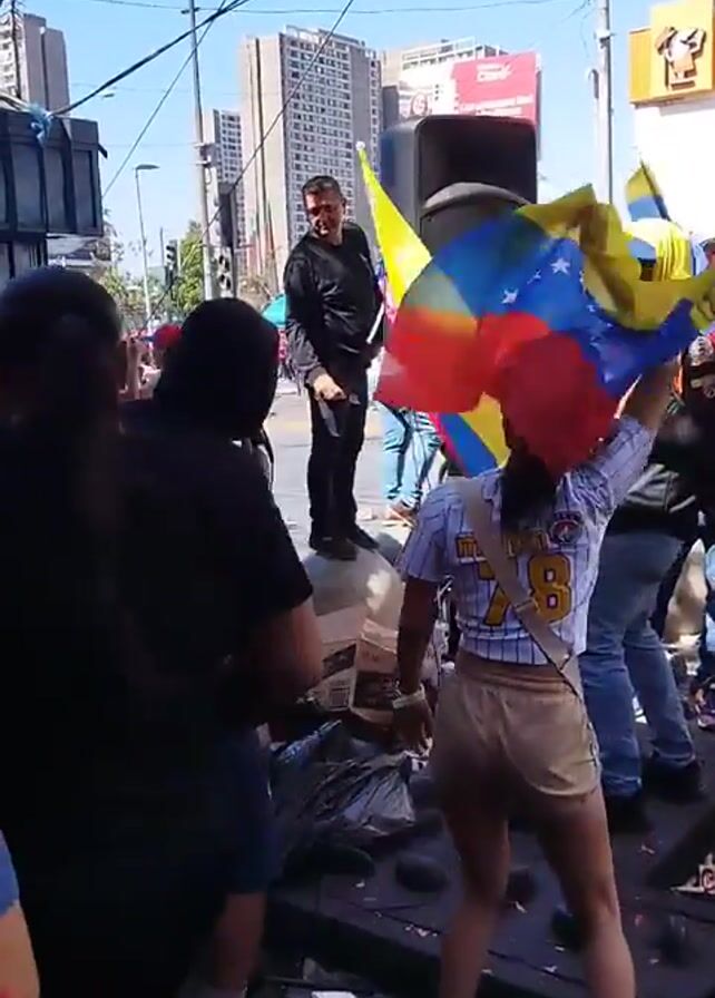 A group of people, some with Venezuelan flags, are gathered in what appears to be a public area