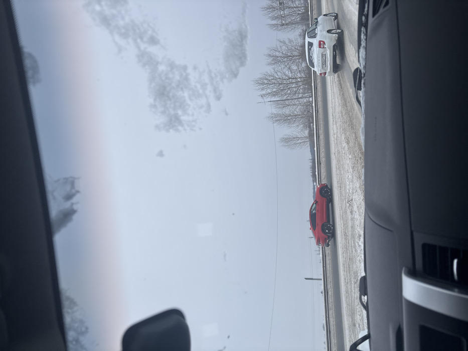 A wintry road scene from inside a vehicle. A red car and a white car are on the right side of the road. Snow covers the ground, and bare trees line the roadside. The sky is overcast. The vehicle's interior, including parts of the dashboard and windshield, are visible.