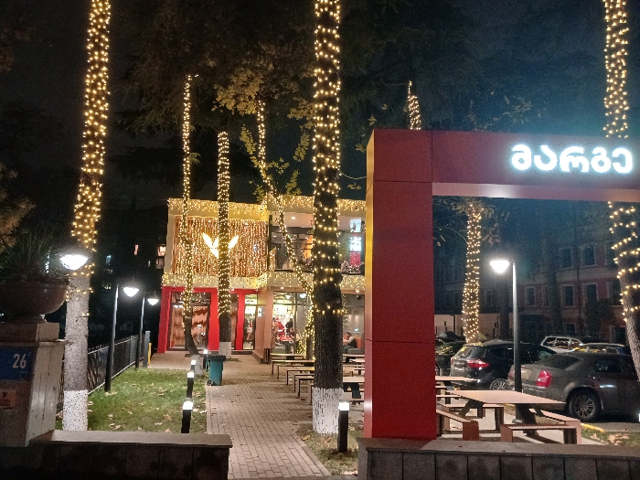 A two-story building, possibly a restaurant or shop, is adorned with festive lights. Trees lining the walkway are also wrapped in lights. A red frame with Georgian script above it sits to the right. Picnic tables are located outside the building, and cars are parked beyond. The scene is set at night, with the festive lights illuminating the area.