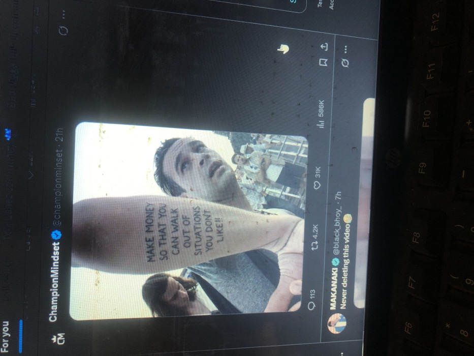 A screen displays a Twitter post. The username "@ChampionMindset" appears. The post features a photo of a man with a tattoo on his arm reading, "MAKE MONEY SO THAT YOU CAN WALK OUT OF SITUATIONS YOU DON'T LIKE!!" Below this is a second tweet by MAKANAKI @black_bhoy stating, "Never deleting this video." The post has 113 comments, 4.2K retweets, 31K likes, and 586K views. A laptop keyboard is visible on the right side of the image.