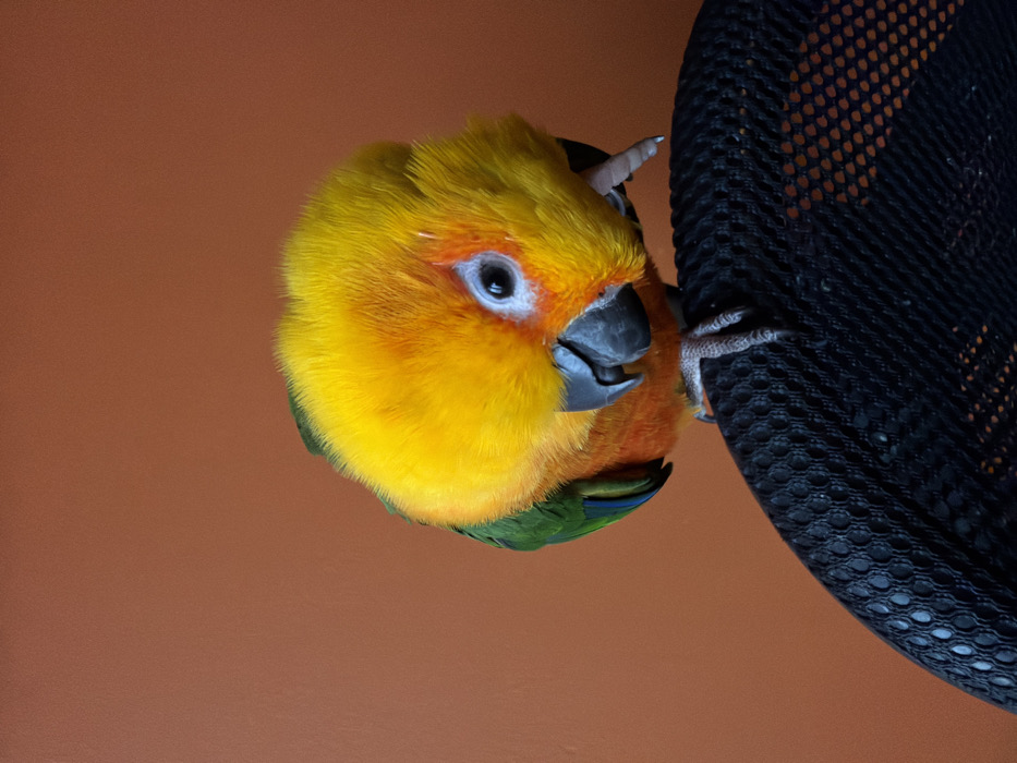 - "A vibrant sun conure, predominantly yellow and orange, perches upside down on a black mesh surface" by FM-e1BLf2, licensed under CC BY 4.0