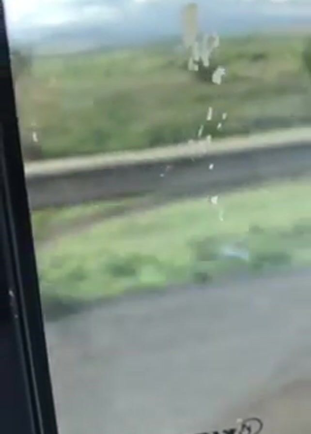 view from the passenger window of a moving vehicle. The camera captures the roadside scenery, including a gray guardrail, a grassy field with scattered trees, and mountains in the distance under a partly cloudy sky. The road is gray with a white stripe. A blurry, dirty pickup truck passes by. The window appears to be dirty and shows safety markings. Loud music plays in the background.