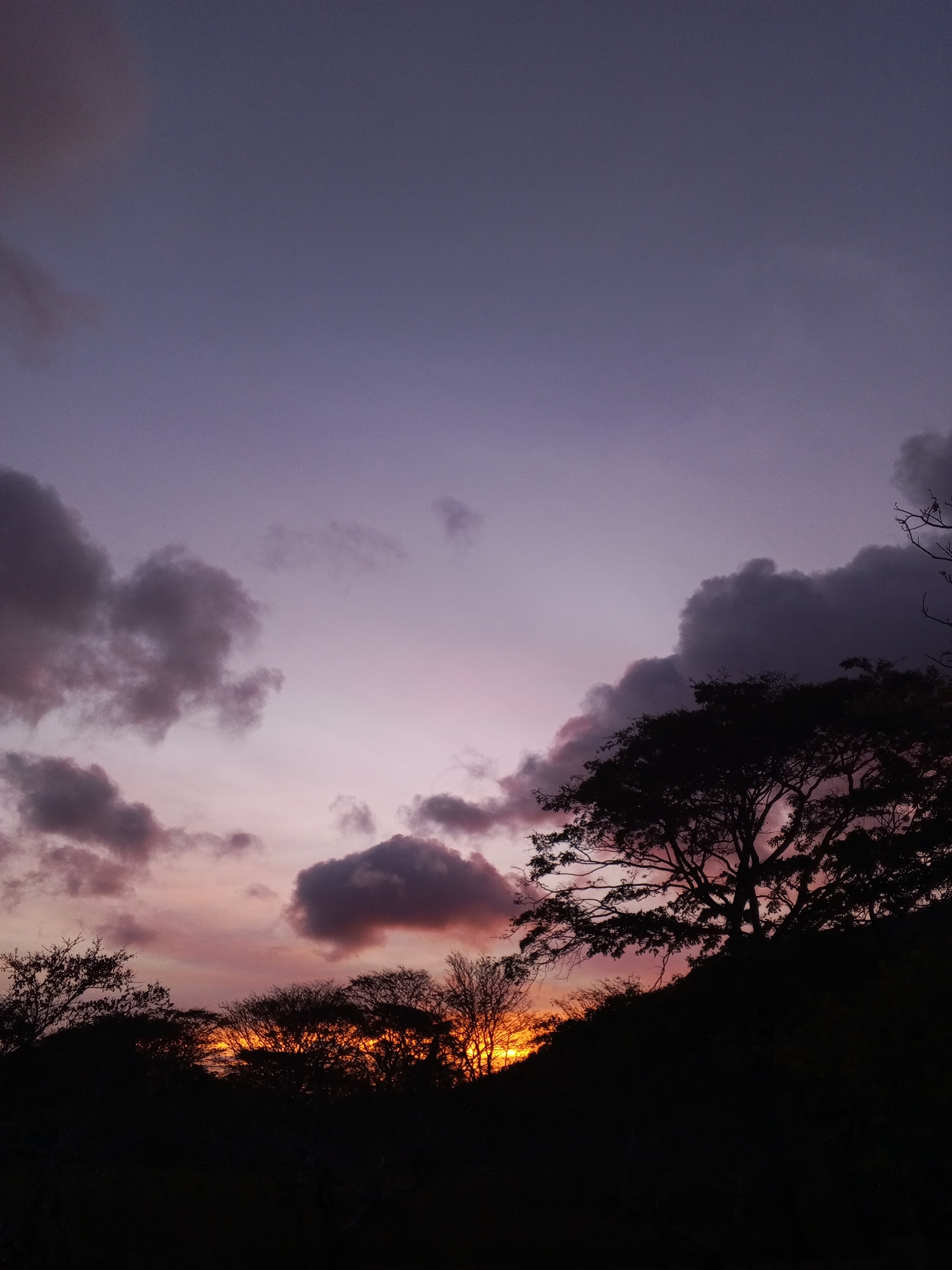 The image captures a sunset scene in Santa Ana, Venezuela. The sky transitions from purple at the top to a pinkish-orange near the horizon. Dark silhouettes of trees cover the lower portion of the frame, with some areas showing bright orange light peeking through them. Clouds are present, appearing dark against the colorful sky. The setting is natural, likely a rural or less developed area within Santa Ana.