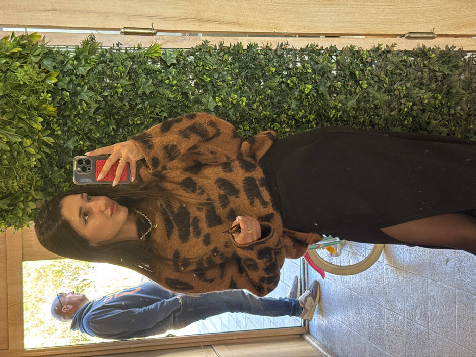 The scene depicts an interior setting in Novoselje, Montenegro. A female subject, with long dark hair and wearing a brown and black leopard print sweater, a black skirt with a left thigh-high slit, and dark hosiery, is visible from the chest down to the mid-calf. She is holding a silver-cased smartphone with a red pop-it style accessory on its back in her right hand, positioned to capture her reflection in a mirror for a selfie. She wears multiple rings on her right hand and a gold-colored chain necklace with a crescent moon pendant. Her gaze is directed slightly to her right. In the background, to the left of the primary subject's reflection, a male subject is visible from the mid-thigh up. He has short hair, wears a blue hooded sweatshirt and blue jeans, and light-colored sneakers. His hands are in his pockets, and he faces left, looking out of a doorway or opening that leads to a bright outdoor area with visible foliage. The reflection of a child's bicycle, white with pink accents, is partially visible between the female subject and the male subject, on the tiled floor. The floor consists of light gray square tiles. To the right of the female subject, a wall covered in artificial green foliage is visible. The immediate surroundings include light wood-paneled walls or doorframes.