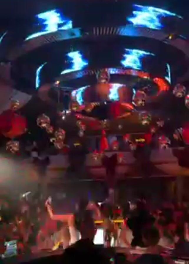 bustling nightclub with many people dancing. The dance floor is crowded, with a raised platform in the middle where two women appear to be performing or DJing. Above the dance floor are several large disco balls and red lanterns hanging from the ceiling. A large, circular structure is suspended above the dance floor with blue lights flashing around its edge. There are green laser lights shining down from above. The lighting is dynamic, with various colors illuminating the space. The video is shot from within the crowd, with people in the foreground partly obscuring the view. The camera moves slightly.