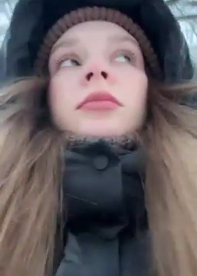 person in a black hooded winter coat and brown knit hat. The person has long, light-brown hair and is looking around while outside on a snowy day.