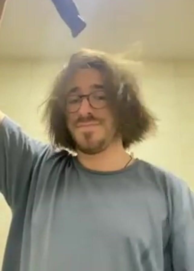 person using a black hairdryer to dry their hair in a bathroom. The person is wearing glasses and a gray t-shirt. The bathroom has light-colored tiled walls. The person’s hair is medium length and appears somewhat messy, initially in a top knot. They move the hairdryer around their head to dry their hair evenly.