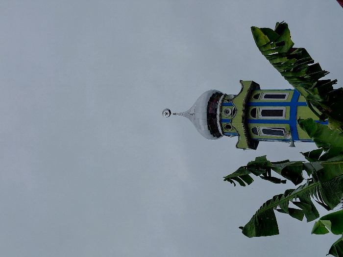 The image displays a mosque minaret in Langsa, Indonesia, under an overcast, light grey sky