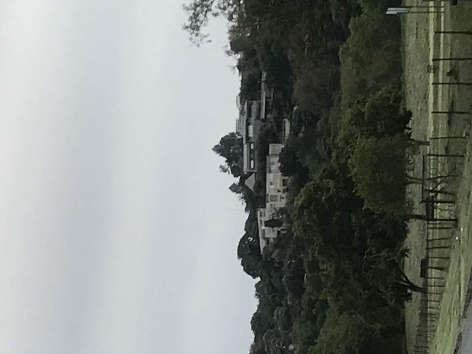 A hazy, overcast sky dominates the upper left. A hill rises, covered in dense green trees and shrubs. White buildings and houses are built into the hillside amidst the foliage. A grassy field is on the right side of the frame. A fence runs along the edge of the field, partly obscured by a small tree. The scene is generally soft and lacking in sharp detail.