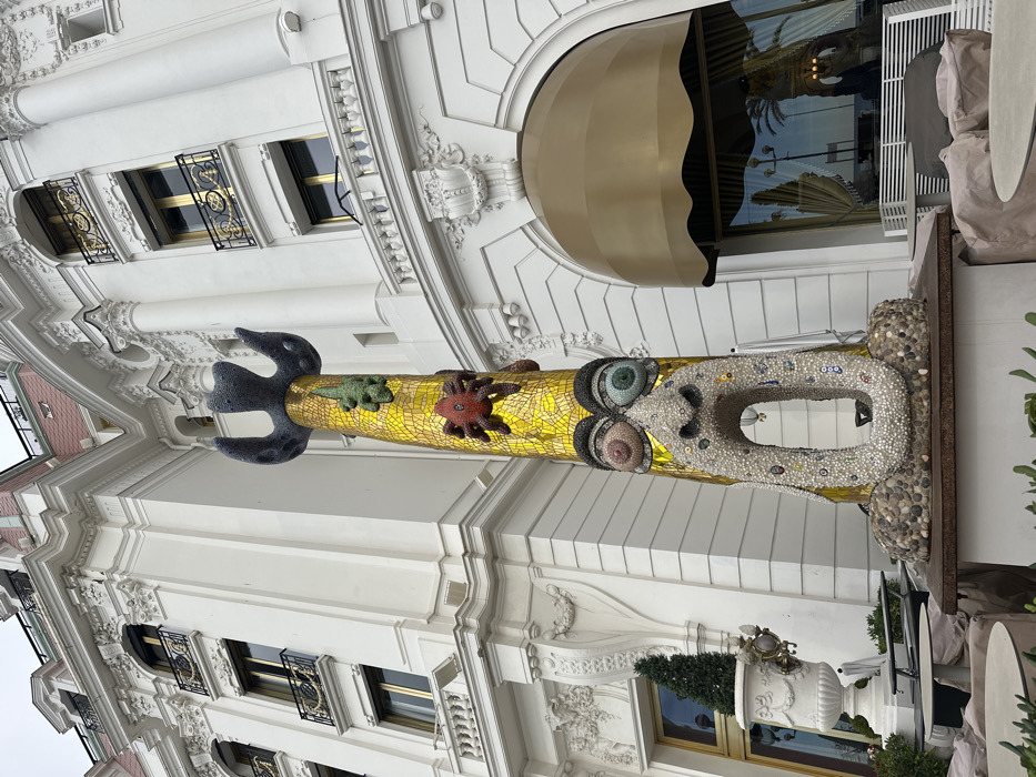 The image depicts a tall, multi-colored mosaic sculpture, identified as "Le Phare" by Arman, positioned outdoors in front of the ornate Hotel Negresco on the Promenade des Anglais in Nice, France. The sculpture features a lower section crafted from light-colored pebbles forming a stylized open-mouthed face with two large, mismatched mosaic eyes (one reddish-brown, one green-blue). Its mid-section is covered in bright yellow mosaic tiles, adorned with smaller mosaic figures, specifically a green lizard-like creature and a red-orange crab-like creature. The top culminates in a darker, possibly grey, mosaic structure with three upward-curving protrusions. Behind the sculpture, the Hotel Negresco is visible, a grand, multi-story white building characterized by classical columns, intricate moldings, windows with black wrought-iron balconies (some with gold accents), and a reddish-pink roofline. To the immediate left of the sculpture, a large white decorative urn contains a small evergreen plant, with a wall-mounted light fixture nearby. To the right, an arched entrance is covered by a beige/gold awning, beneath which large windows reflect glimpses of palm trees and the sky, suggesting proximity to the sea. In the lower foreground, several round outdoor tables and cushioned seats, covered in beige fabric, are present. No discernible individuals or specific actions are visible; the scene is illuminated by diffused daylight, indicative of an overcast sky.