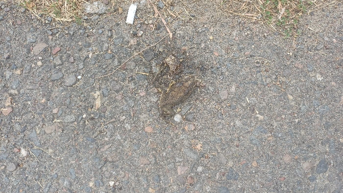 - "A dead, desiccated frog lies on a paved surface strewn with pebbles and small stones" by FM-XKDpn2, licensed under CC BY 4.0