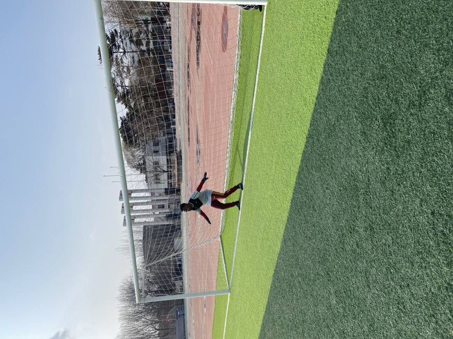 The image captures an outdoor sports scene in the city of Linghe, China. A male individual is positioned inside a white-framed soccer goal with a white net, standing in a crouched, ready stance on green artificial turf. He wears a dark green and white shirt, maroon pants with a yellow stripe down the side, black gloves, and dark shoes. A white line marks the goal area on the artificial turf, and a shadow from the goal extends across the foreground. In the background, a red running track surrounds the field, beyond which several buildings with visible pillars and windows, along with bare trees, are discernible under a clear blue sky.