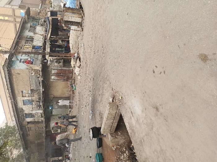 A street scene shows dilapidated buildings alongside a cracked asphalt road. Several people stand near a small fire. One individual appears to be tending to the fire. Trash and debris are scattered along the road and in front of the buildings. A utility pole with wires is visible against the backdrop of the run-down structures. The overall impression is one of urban decay and poverty.