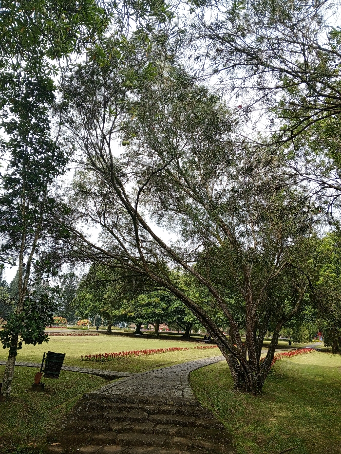 A stone path leads into a park-like setting. Green grass covers the landscape, punctuated by lines of red flowers. Several mature trees stand on either side of the path. Some trees have fruit. A bench sits in the distance. The sky is visible through the trees. Steps ascend to the path. The scene has a peaceful and natural atmosphere.