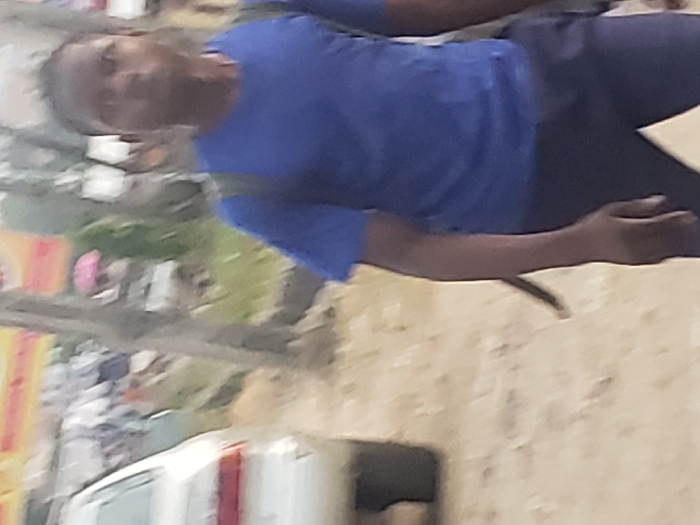The image presents an outdoor scene identified as Lokoja, Nigeria. A male individual, appearing to be of African descent, occupies the foreground, positioned centrally and facing directly towards the viewer. He wears a blue short-sleeved t-shirt, dark trousers, and a dark backpack. His hair is dark and short. The ground is unpaved and appears dusty or sandy. To the left, a portion of a light-colored sedan vehicle is visible. Behind the foreground subject, a tall, slender, light-colored pole or tree trunk is discernible, with green vegetation immediately behind it. The background is significantly blurred, containing indistinct figures, possibly people, and structures, including a prominent blurred yellow and orange sign in the upper left, and a hint of a pink umbrella. The lighting suggests daytime. No explicit actions or interactions are clearly identifiable due to the image's overall blurriness.