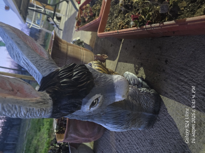 The image displays an outdoor scene in Svishtov, Bulgaria, captured at 6:45 PM on March 16, 2026, by a Galaxy S24 Ultra device. The central subject is a gray statue of a donkey, featuring prominent ears with pink inner surfaces, a dark, textured mane, and a white muzzle, with its head lowered and facing slightly left. This statue rests on a light gray, textured concrete or paved surface, which displays a shadow cast by the statue extending towards the lower left. To the immediate left and behind the donkey statue, several brown planters are visible, some containing dried plant material. To the right of the statue, an orange-brown rectangular planter holds soil and dried red plant fragments. In the background, an outdoor patio area is present, featuring a light-colored metal-framed table and a matching chair with a mesh-like top. A white and black domestic animal, possibly a cat, is visible near the legs of the table. A metal-framed shopping cart is partially visible behind the table and chair. Further in the background, a grassy area and indistinct vegetation are present under ambient light conditions consistent with late afternoon or early evening.