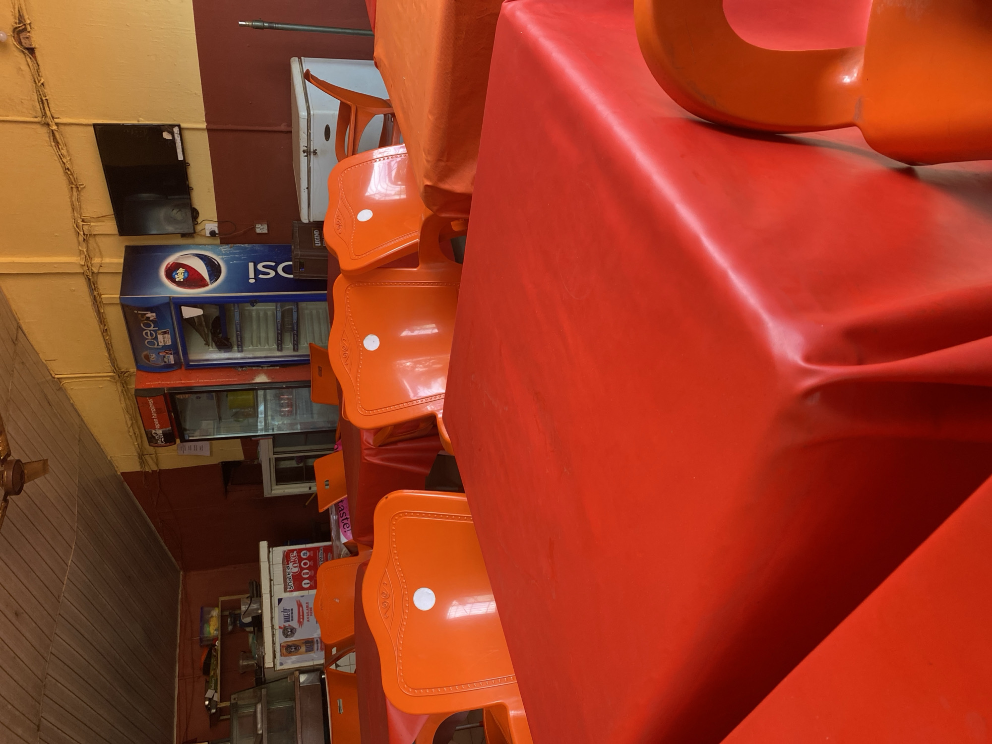 A commercial space, possibly a small restaurant, in Nsukka, Nigeria, features stacked orange plastic chairs with decorative white circles on their backs, some with attached orange tables and others covered with a larger red tablecloth