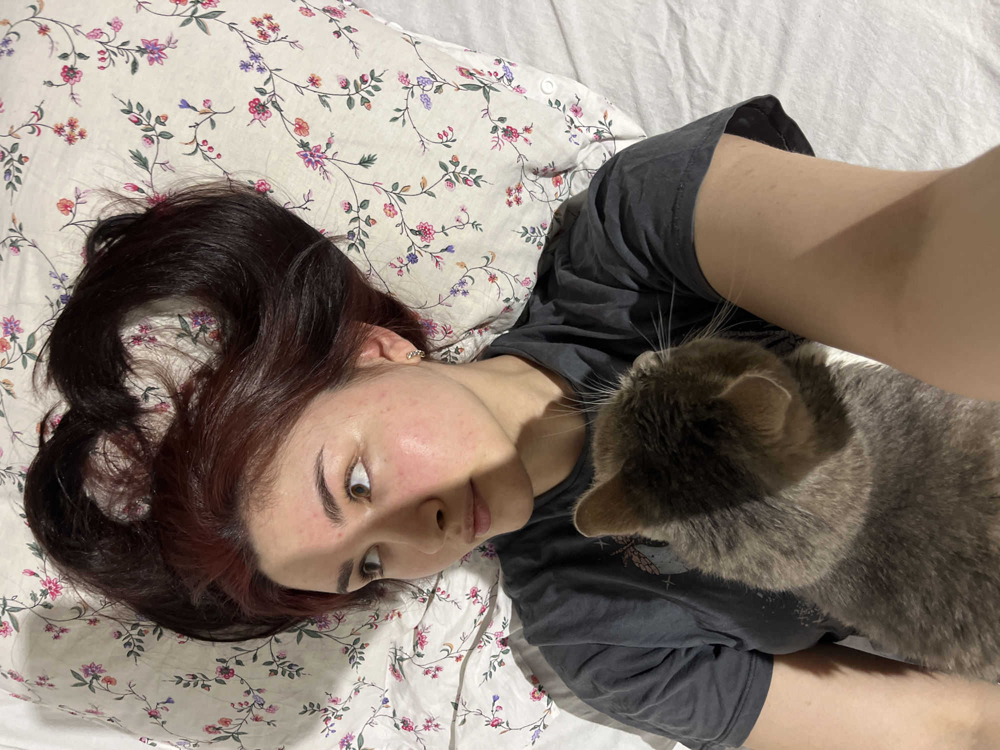 A woman is lying on her back on a bed with a floral patterned comforter. She has dark hair with red highlights. A gray cat is positioned on her chest. The location is unknown and there is no indication it is Neftekamsk, Russia.