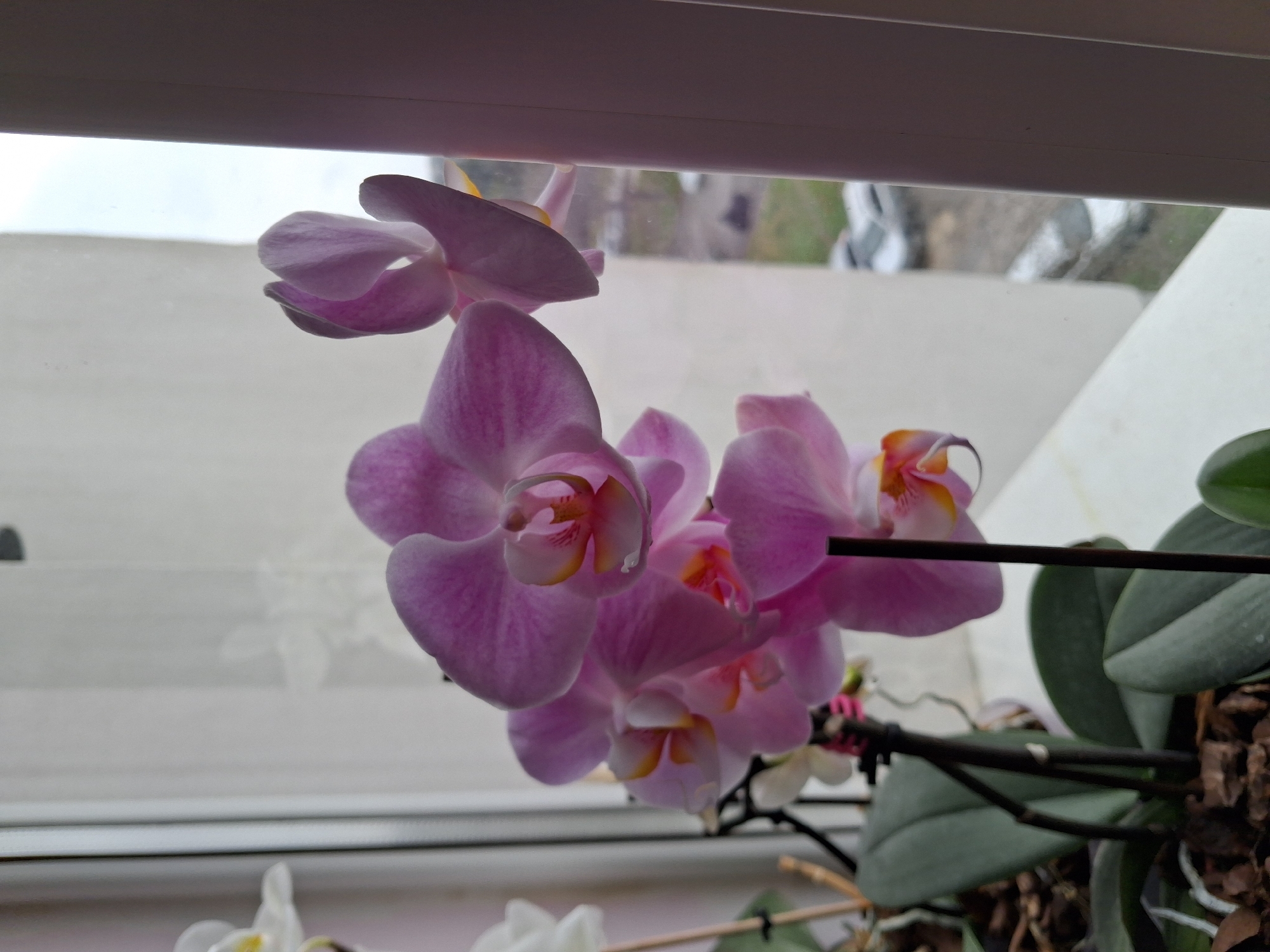 The image displays a static indoor scene set on a windowsill in Varna, Bulgaria. The primary subject is a cluster of blooming Phalaenopsis orchids, predominantly light purple with darker venation and centers featuring yellow, orange, and white accents. Multiple individual flowers are visible, arranged on stems. Below the flowers, several deep green, oval-shaped leaves are present, along with dark support stakes inserted into a visible potting medium composed of bark chips. A second orchid plant with white blossoms is partially visible on the extreme left. The plants are situated on a plain white windowsill. Through the window, a blurred outdoor environment is discernible, showing a light, overcast sky at the top, a section of green ground below, and several light-colored, parked vehicles, suggesting a street or parking area. A thick, light-colored vertical window frame or interior wall segment occupies the right side of the frame. No human figures or active interactions are depicted.