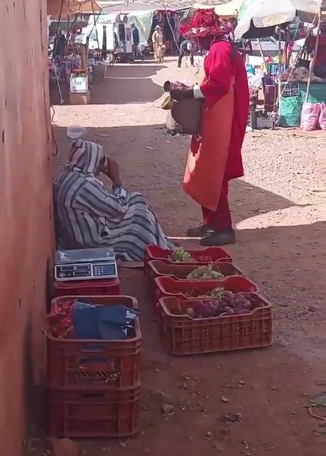 The scene takes place outdoors at what appears to be a market. A person wearing a long red robe and distinctive red hat is standing next to several crates of grapes, playing a small wind instrument. A man wearing a striped robe is sitting next to a scale, leaning against a reddish wall. Another man wearing a black jacket and pants is picking up grapes from a crate. There are other people in the background walking through the market, which has stalls covered by awnings. The ground is dirt.