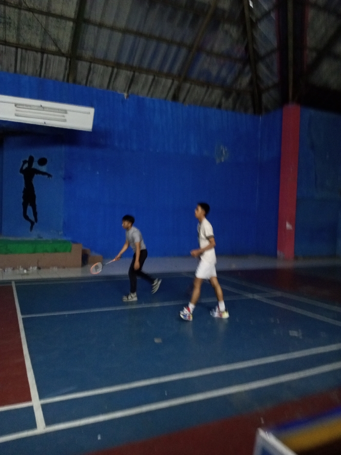 - "Two young males are playing badminton on a blue court with white lines, inside an indoor stadium with a high ceiling" by FM-RpQWt1, licensed under CC BY 4.0