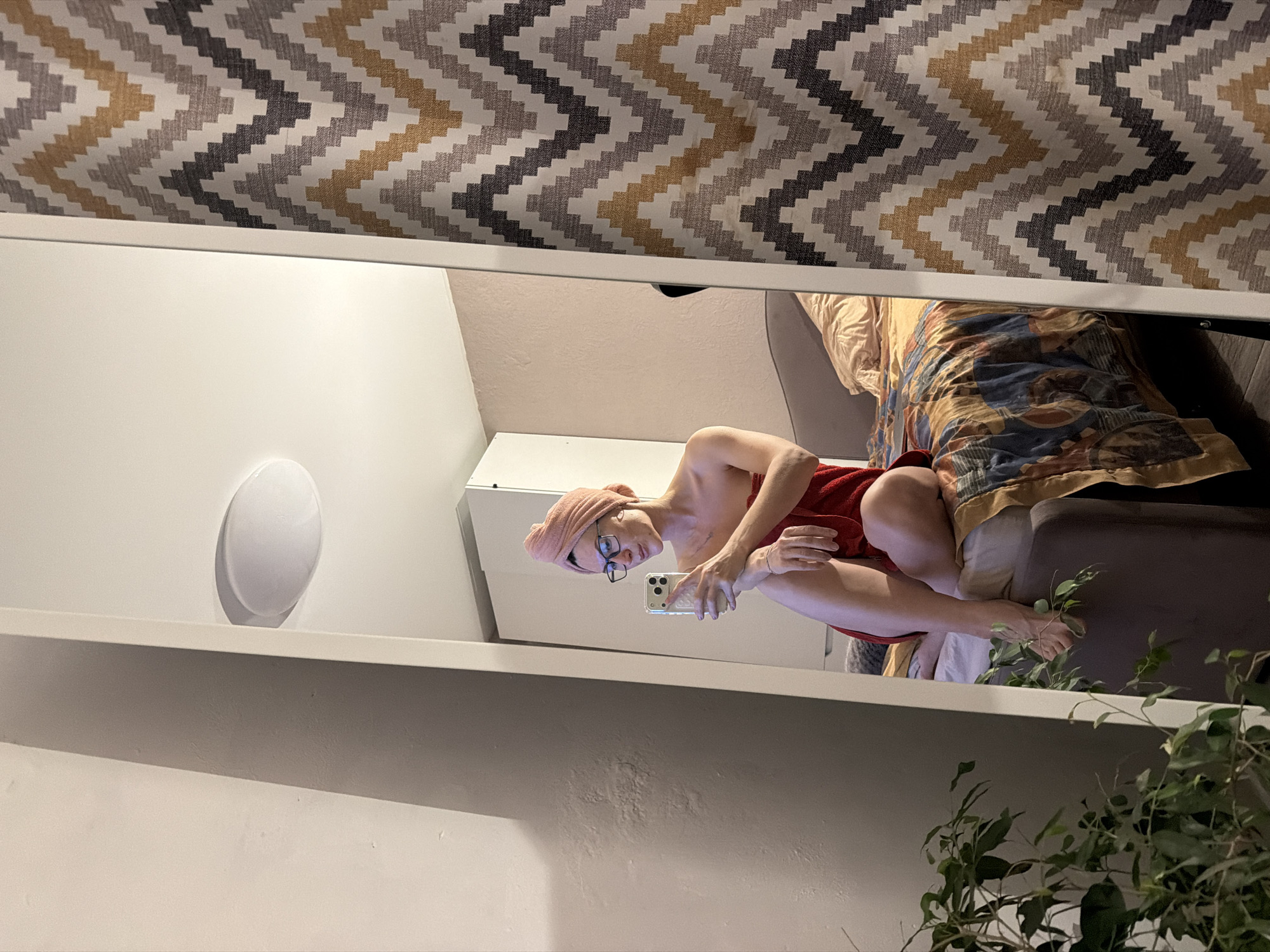 The image displays an indoor scene, specifically a bedroom, located in Perm, Russia. A light-skinned female individual is seated on the edge of a bed, captured in a full-length, white-framed mirror that dominates the central and right portion of the frame. She wears dark-framed eyeglasses and has her hair wrapped in a light pink towel turban. Her torso is bare, and her lower body is covered by a red towel, extending from her chest to her upper thighs. A facial mask is visibly applied to her cheeks. She holds a light-colored smartphone, equipped with a clear patterned case, in her left hand, directing it towards her reflection as if taking a selfie. Her right hand rests on her left leg. Her bare feet are visible, with the left foot slightly elevated. The bed features a dark grey upholstered headboard and base. The bedding includes a patterned duvet cover in shades of gold, blue, and brown, along with a light-colored pillow. Behind the reflected figure, a white two-door wardrobe or cabinet is partially visible against a light, warm pinkish-beige wall. To the immediate left of the mirror frame, a plain light grey wall is visible. The white ceiling above features a circular, white, flush-mounted light fixture. A large green potted plant with numerous leaves is positioned in the bottom-left foreground, partially obscuring the mirror's lower left corner. To the right of the mirror, outside the reflection, a patterned fabric, likely a curtain, is visible; it features a chevron or zigzag design in grey, dark grey, white, and golden-brown hues. The room is illuminated by artificial light sources.