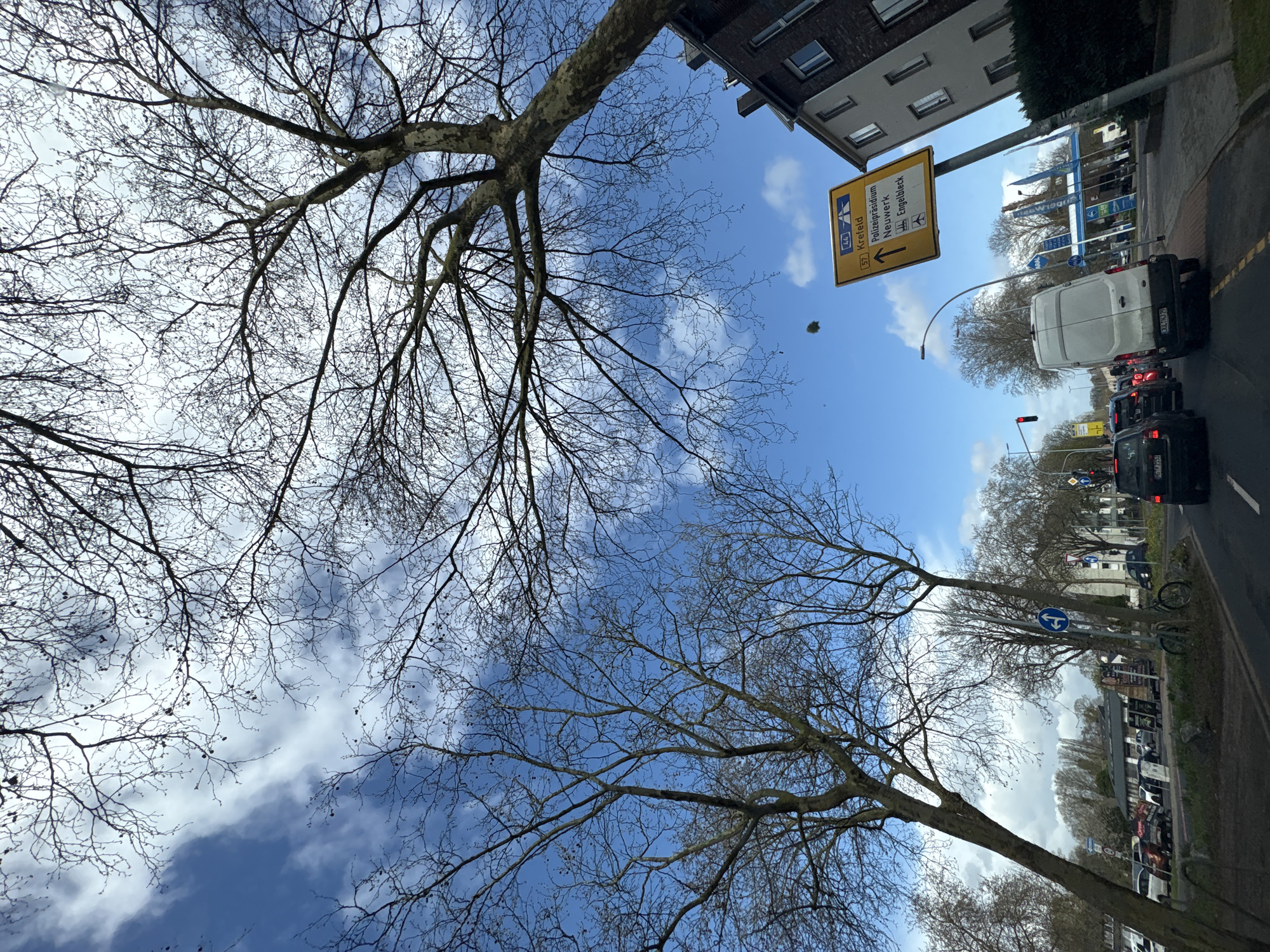 The image depicts a street scene in Mönchengladbach, Germany, on a day with a blue sky and scattered clouds. Two bare trees frame the view, their branches reaching across the sky. A yellow road sign indicates directions to Krefeld, Polizeipräsidium, Neuwerk, and Engelbleck. Traffic is present, including a white van and a black car. Buildings line the street, with a gas station visible in the background. A road sign directs traffic.