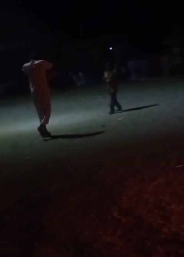 n outdoor night scene centered around a bonfire. Two people are visible, standing on the grassy ground near the bonfire. One person wears a long, light-colored garment. The other person is wearing a dark jacket and dark pants. The camera pans slightly to show the large bonfire, surrounded by what appears to be wood or debris. The surrounding environment is dark, but a light can be seen in the background.