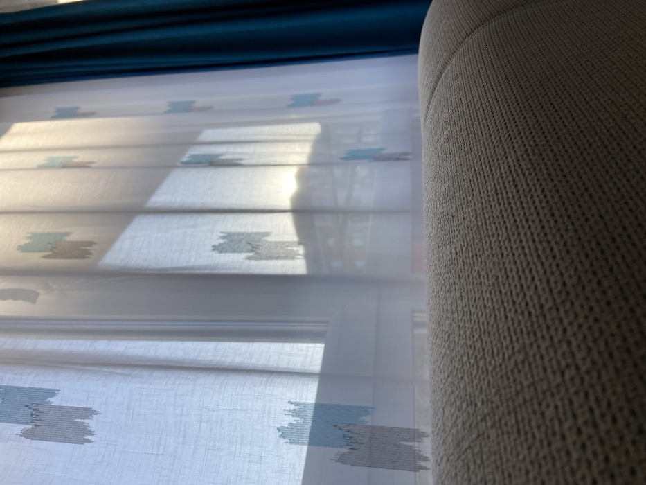 The image captures an indoor scene from a residence in Pernik, Bulgaria, looking outwards through a window. The lower half of the frame is occupied by the textured, light beige woven fabric of an upholstered furniture piece, likely a sofa or armchair, extending from the bottom left to the right. Above this, a window is visible, covered by sheer white curtains adorned with repeating vertical abstract patterns in light blue and muted brown/beige. A teal or dark blue opaque curtain is drawn to the far right. Through the sheer curtains and the window pane, a diffused outdoor scene is apparent. Distant buildings with visible windows are faintly discernible. A silhouette of a low hill or mountain range is visible against a brightly lit sky, suggesting a sunrise or sunset. No individuals or active interactions are depicted.