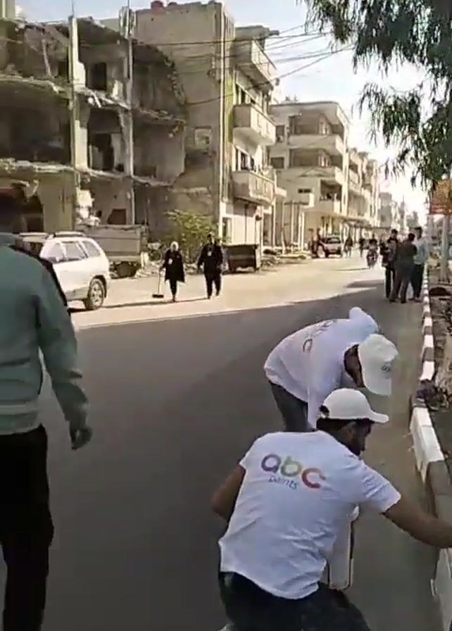 group of people cleaning up a street in what appears to be an urban area. The street is lined with buildings, some of which show signs of damage. In the first shot, three men are painting the curb white. They are wearing hats and casual clothes, and one has a shirt with "abc paints" on it. The next shot shows a man walking down the street, past a building with closed metal shutters. The following shots show a group of people sweeping the street and using a wheelbarrow to collect debris. A truck is visible, filled with garbage and green waste. The overall impression is of a community effort to clean and restore a damaged area.