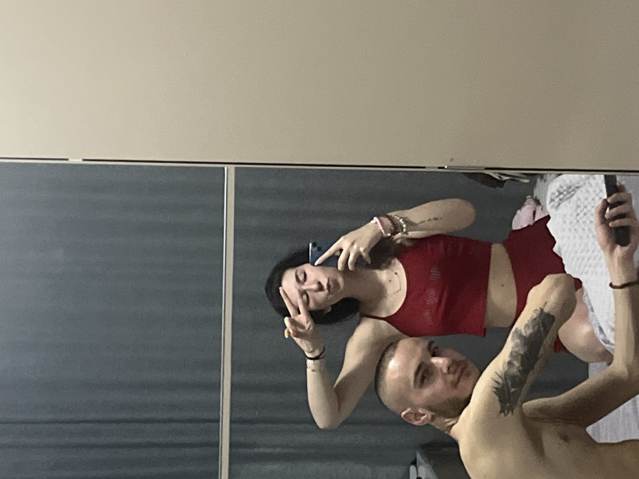 This image depicts a mirror selfie taken indoors in Plovdiv, Bulgaria. The scene shows two young adults, a male and a female, reflected in a mirror. The female, positioned closer to the mirror, is holding a dark-colored smartphone with her right hand to capture the image. She has long dark hair, is wearing a red sleeveless crop top and red shorts, and is making a peace sign with her left hand while pouting her lips towards the phone. Her left arm displays several bracelets. To her left, partially obscured, sits a male. He has a shaved head, a short beard, is shirtless, and has a large dark tattoo on his left upper arm. He is looking directly at the camera with a neutral expression. Both individuals appear to be seated on a bed covered with white and grey bedding. The background visible in the reflection includes a grey curtain or textured wall covering behind them and a light-colored, possibly white or beige, wardrobe or closet door to the right.