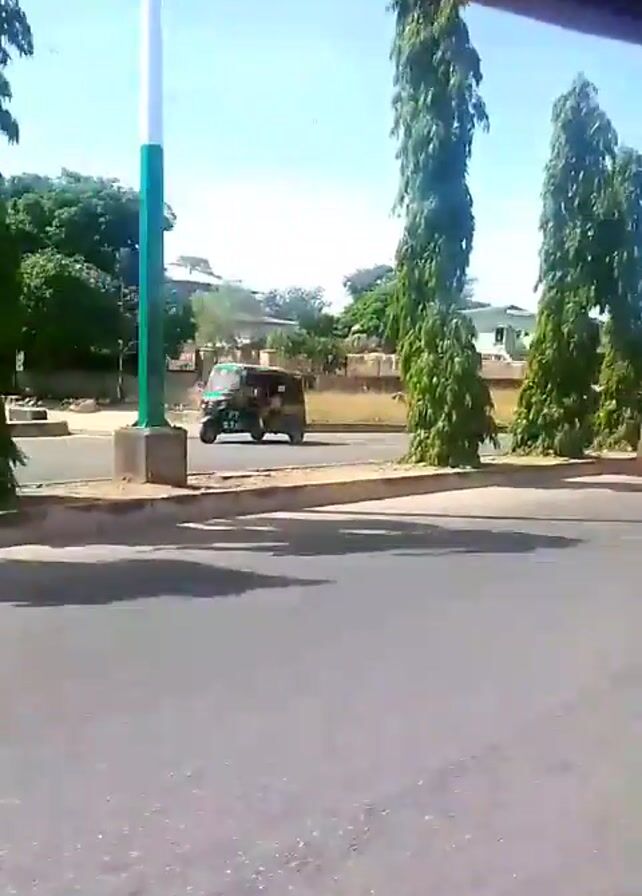 view from inside a moving vehicle, likely a motorcycle or auto-rickshaw, looking out onto a paved road. The road is flanked by a curb and a raised median with tall, thin green trees lining it. Across the road, there is a building and some dry vegetation. Another auto-rickshaw is seen driving in the opposite direction. The sky is clear and blue.