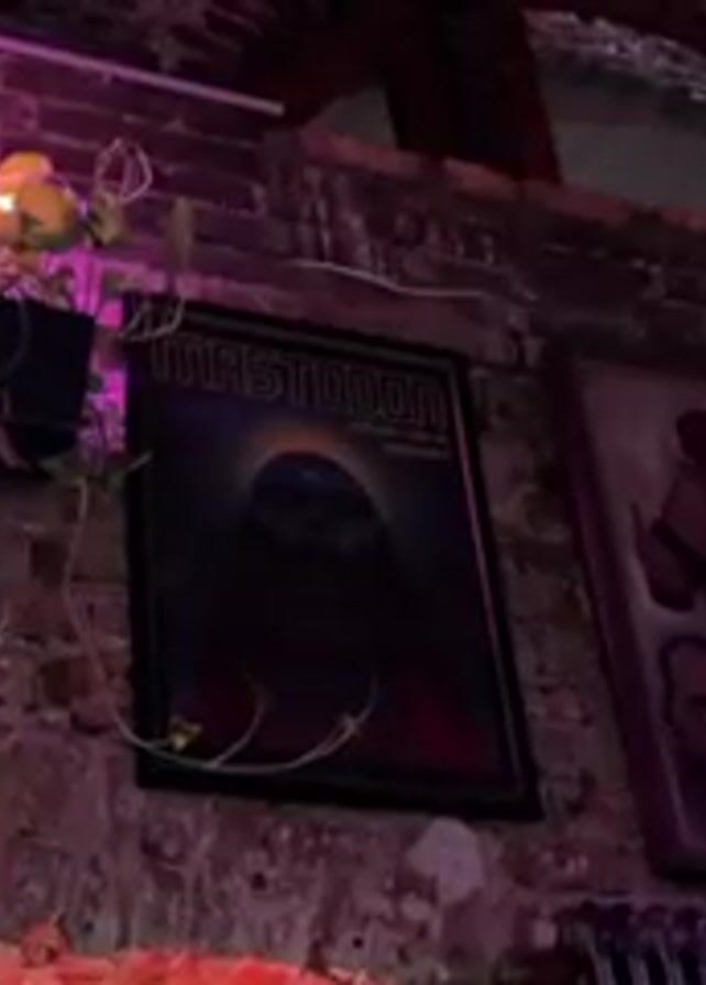 dimly lit room with exposed brick walls. A Mastodon band poster and another framed illustration hang on the wall. A spotlight illuminates a potted plant above the posters. The room has an arched ceiling with a small window. The lighting has a purple hue.