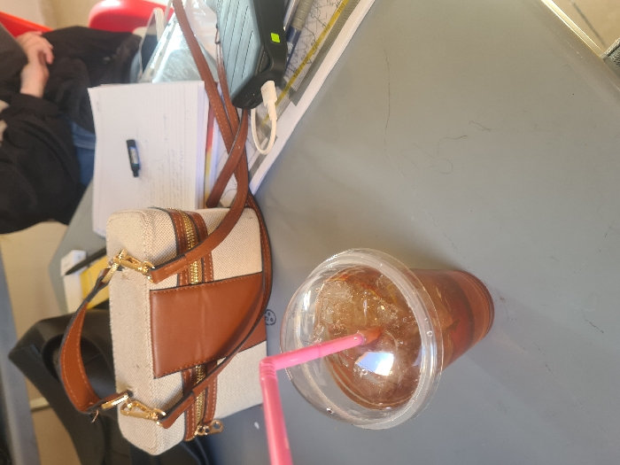 The image displays an indoor scene on a light grey table in Jibb as-Safa, Syria. In the lower left foreground, a clear plastic cup, filled with an amber-colored liquid and ice cubes, features a clear domed lid and a pink plastic straw. To the right and slightly behind the drink, a small, rectangular handbag with a beige canvas body, brown leather-like accents, and gold-colored zippers lies on the table. A brown shoulder strap extends from the bag. Further to the right and rear, a stack of white papers, exhibiting handwritten text, is present, topped by a small dark-colored marker. Adjacent to the papers on the right, a black rectangular electronic device, consistent with a power bank, is partially visible, connected to a white USB cable. In the upper right background, the upper torso and arms of an individual wearing dark clothing over blue jeans are partially discernible, seated at the table. A portion of a red chair back is also visible behind them.