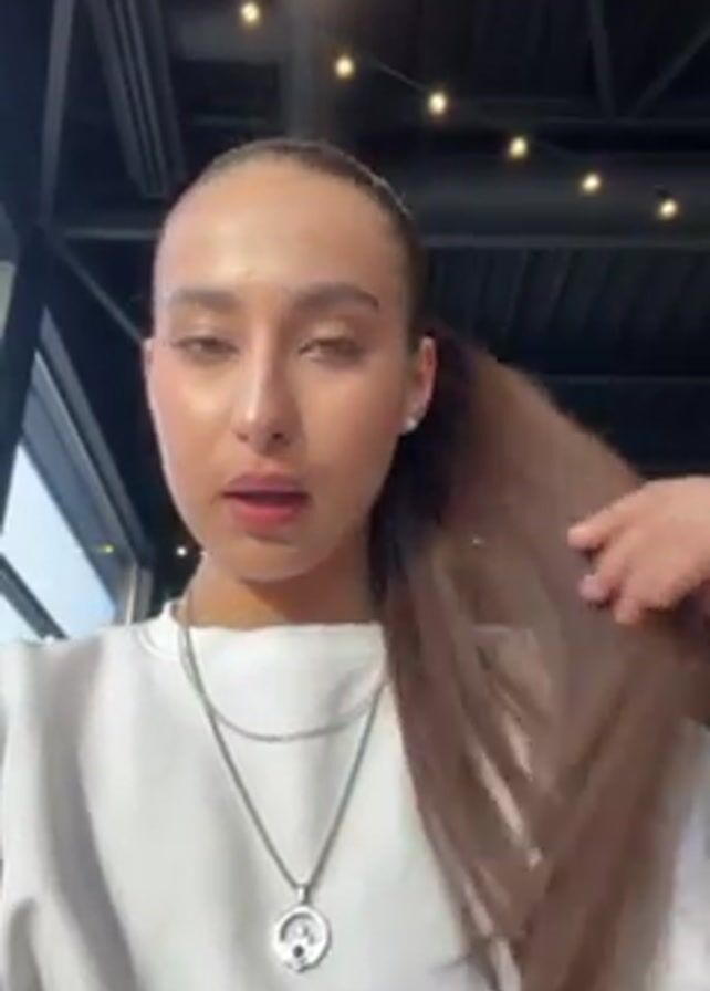 young woman with brown hair in a high ponytail. She is wearing a white sweatshirt and a silver chain necklace with a circular pendant. The camera is positioned below her, capturing a low-angle shot of her face and upper body. The background shows a ceiling with exposed metal beams and string lights. The woman looks directly at the camera, then tosses her hair and purses her lips slightly. There is sunlight streaming through a nearby window. Music plays in the background.