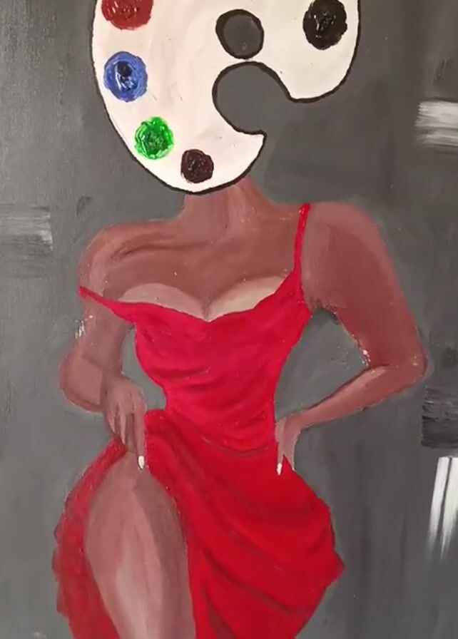 A close-up video shows an acrylic painting of a woman with a color palette as her head, wearing a red dress