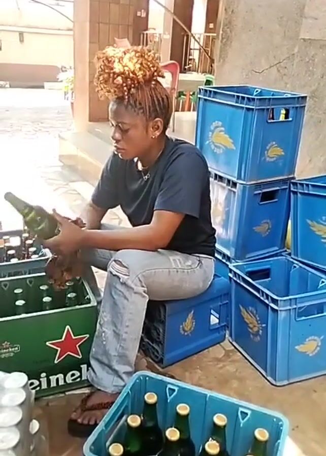 A person with tan skin, medium build, wearing a dark gray t-shirt, light-wash distressed jeans, and brown sandals is sitting on a blue plastic crate. Their hair is styled in a high bun with blonde and brown coloring. They are sorting through green beer bottles, inspecting them, and placing them into different crates. There are blue and green plastic crates surrounding the person, some full of bottles and some empty. The green crates have the Heineken logo on them. The blue crates have a logo of a bird. The area appears to be a warehouse or outdoor storage area with a concrete floor.