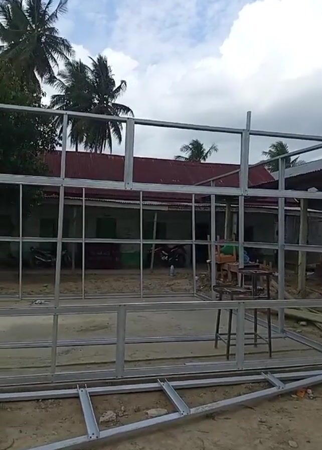 The camera pans to the left across the construction site of a building made with steel beams. The frame of the building is up but incomplete, with horizontal beams still on the ground. There are several motorcycles, tables, and chairs within the building, and what seems to be construction workers in the background. Several palm trees tower over the surrounding buildings, and the sky is cloudy.