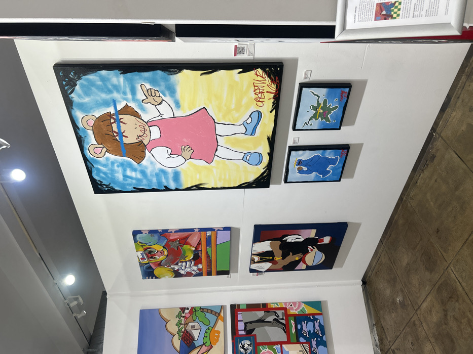 A wall showcases various framed paintings in an art gallery setting. The largest features a cartoon-like figure with a brown bob and a blue horizontal line across its eyes, wearing a pink dress and blue shoes, set against a yellow and blue backdrop. Other paintings include abstract landscapes, a blue cartoon character, and further abstract or cartoon-style compositions with vibrant colors. The wall is painted white, and the floor appears to be tiled.