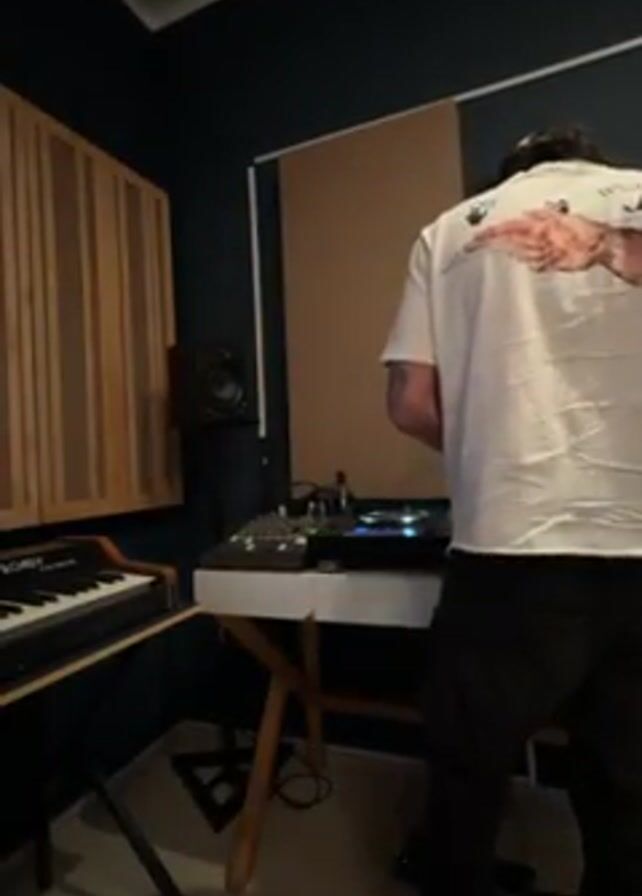 person standing in a music studio. The person is wearing a white t-shirt with a graphic on the back and dark pants. They are facing away from the camera, operating electronic music equipment, which is on a white table. In the background, there's a keyboard, a wooden sound panel, and a speaker. The walls are dark blue-green.