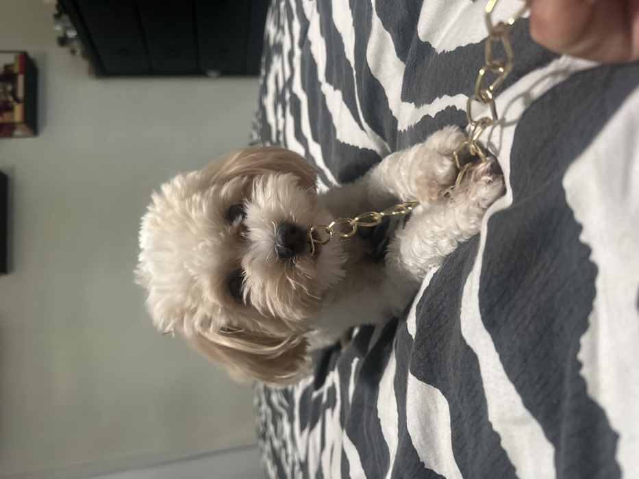 The scene depicts an indoor domestic environment, likely a bedroom, located in Fort Lauderdale, United States. A small, light-colored, fluffy dog with cream and white fur is positioned prone on a bed. The bed is covered with a black and white zebra-patterned duvet or sheet. The dog holds a section of a gold-colored link chain in its mouth. The chain extends from the dog's mouth towards the bottom right corner of the frame, where a human hand, specifically two fingers, is observed holding the chain's end. The background features a light-colored wall, a dark dresser with multiple drawers, and two wall-mounted decorative shelves or frames containing various small objects. The lighting is ambient. No other individuals are fully visible.